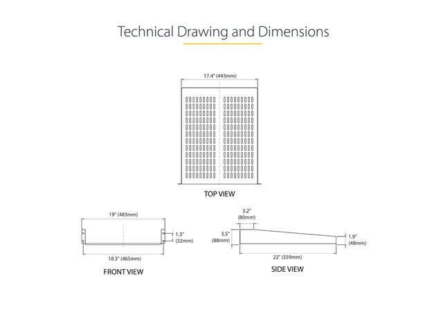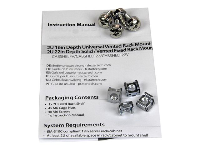 | Product Description | StarTech.com 1U Server Rack Shelf, 2U 22in Universal Fixed Vented Network Rack Shelf/Cantilever Tray for 19" AV/Data/Network Equipment Enclosure w/Cage Nuts & Screws, 50lbs Weight Cap. - 2U Network Rack Shelf (CABSHELF22V) - rack shelf - 2U |