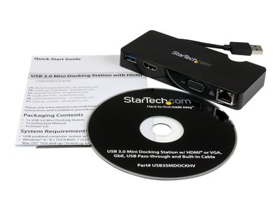 | Description du produit | StarTech.com Mini station d¿accueil / Mini-Dock USB 3.0 universelle pour PC portable - Réplicateur de ports HDMI ou VGA, GbE, USB 3.0 - station d'accueil - USB - HDMI - 1GbE |