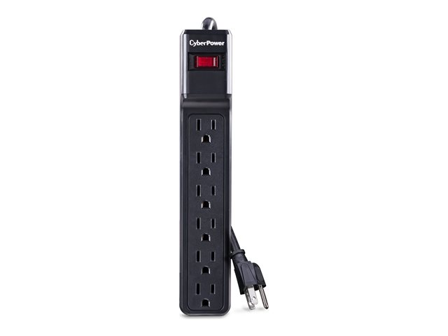 The CyberPower Essential Surge Protector CSB6012 offers vital surge protection for common home and office devices such as computers and electronics. It prevents spikes in energy caused by storms and electrical power surges from reaching your electronic equipment. The CSB6012 provides 1200 joules of protection with 6 outlets and a power cord (12 ft.). Features of the CSB6012 include automatic shutdown, metal oxide varistor (MOV) technology, an EMI/RFI noise filter, keyhole mounting slots, and impact-resistant casing.