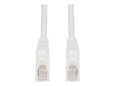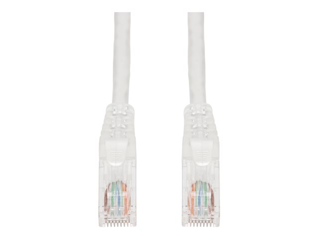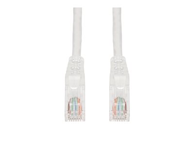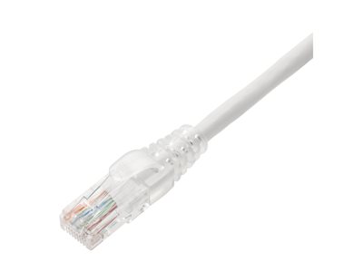 This is a 7ft RJ-45 (male) to RJ-45 (male) white unshielded clear claw twisted pair PVC copper patch cable. The Cat6 cable is a standardized twisted pair cable for Ethernet or other physical network layers. Cat6 standards specify performance of up to 250MHz. This PVC jacketed cable is best suited for LANs or SANs, and is recommended for connection between fiber patch panels, hubs, switches, media converters and routers. Unshielded twisted pair patch cables are perfect for data centers, LANs and other short range network connections.