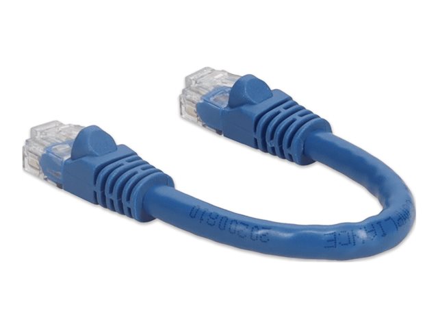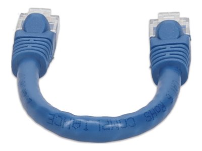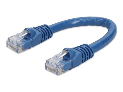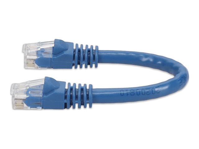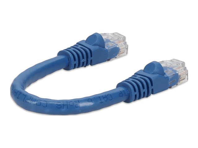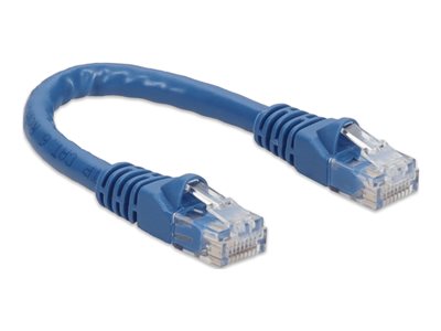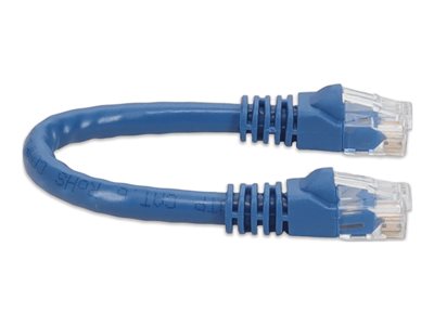This is a 6in Blue CAT 6 PVC Ethernet Cable Snagless Bubble Boot RJ-45 M/M. CAT6 cables deliver ultra-fast internet speeds at up to 250 MHz, with a maximum speed of 10 Gbps (Gigabits per second) over shorter distances (up to 55 meters or 180 feet) and 1 Gbps over longer distances (up to 100 meters or 328 feet). They are ideal for high-performance home or office networks. UTP cables consist of pairs of insulated copper wires twisted together. Each pair is color-coded for easy identification. There is no additional shielding around the pairs, which makes these cables lightweight and flexible. The twisting helps to reduce electromagnetic interference (EMI) and crosstalk between pairs. PVC-CM is ideal for everyday home use, these cables offer reliable performance at an affordable price, perfect for connecting devices within a single floor. These cables are PoE capable and TIA compliant, ensuring performance for all networking needs.