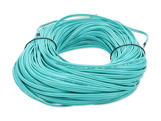 This is a 74.0m (242.8ft) LC (male) to LC (male) aqua OM4 duplex plenum-rated patch straight cable that is used for high speed data transfer. An OM4 cable has a core size of 50m microns that supports 10 Gigabit Ethernet at lengths measuring up to 550 meters, and 100 Gigabit Ethernet measuring up to 150 meters and is reverse compatible with OM3. Plenum-rated cables must self-extinguish and prevent re-ignition. Duplex cabling provides two-strands of fiber and is most commonly used in applications that utilize one lane to transmit and one lane to receive.