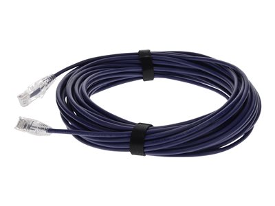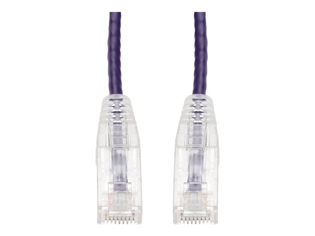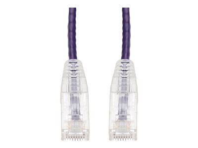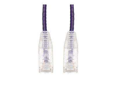 This is a 12ft RJ-45 (male) to RJ-45 (male) purple straight unshielded twisted pair PVC copper slim patch cable. The Cat6 cable is a standardized twisted pair cable for Ethernet or other physical network layers. Cat6 standards specify performance of up to 250 MHz. This PVC jacketed cable is best suited for LANs or SANs, and is recommended for connection between fiber patch panels, hubs, switches, media converters and routers. Unshielded twisted pair patch cables are perfect for data centers, LANs and other short range network connections.