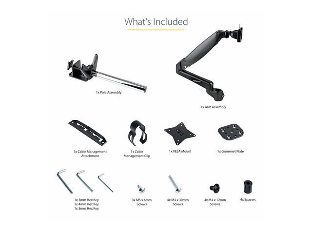 | Contenu de l'emballage | Clip de gestion de câble, ensemble de pôle, clé hexagonale (3 mm), clé hexagonale (4 mm), 4 x vis M4 x 12 mm, 4 x vis M4 x 30 mm, 4 x entretoises, plaque de passe-câbles, clé hexagonale (5 mm), 3 x vis M5 x 6 mm, attache de gestion des câbles |