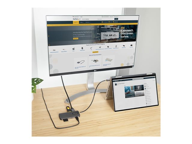 L'adaptateur multiport USB C StarTech.com est un compagnon polyvalent et puissant pour les professionnels en déplacement. Offrant une sortie vidéo HDMI 4K 60 Hz, il garantit des présentations et des flux vidéo d'une grande netteté. L'adaptateur dispose également d'un concentrateur USB-A 3 ports 5 Gbps, permettant un transfert rapide des données et la connexion de périphériques. Grâce à la fonction USB Power Delivery Pass-Through de 100 W, votre ordinateur portable reste chargé sans avoir besoin d'une source d'alimentation supplémentaire. Les lecteurs de cartes SD et microSD intégrés offrent un accès pratique à vos données, tandis que le port GbE garantit une connexion réseau filaire stable. Son design compact en fait une station d'accueil idéale pour les déplacements, qui se glisse facilement dans votre sac. Que vous soyez au bureau ou en déplacement, cette station d'accueil USB C pour ordinateur portable vous permet de rester productif et connecté.