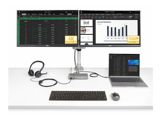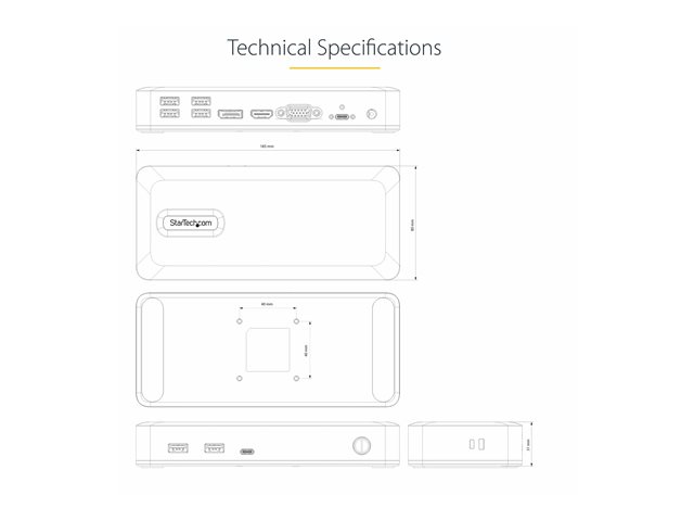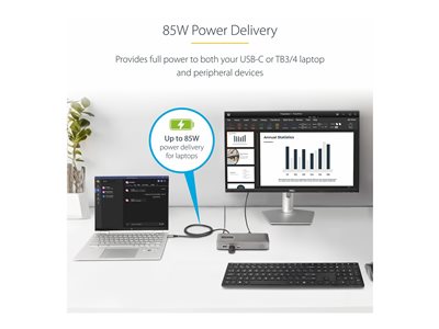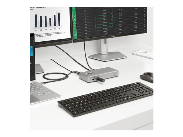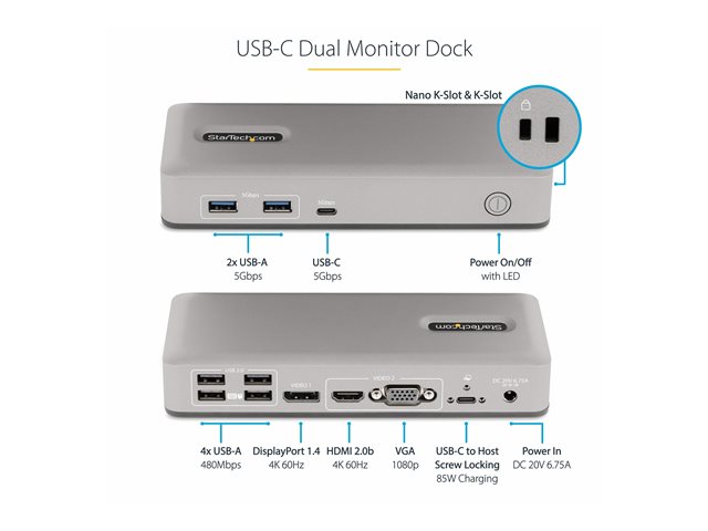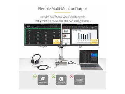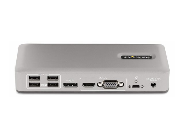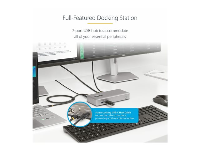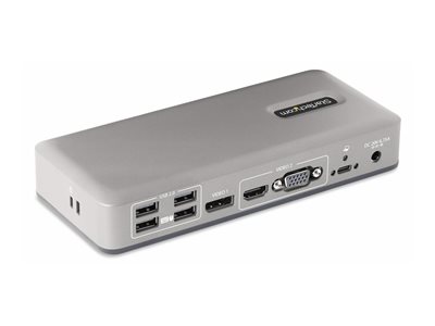 | Description du produit | StarTech.com Dual-Monitor USB-C Docking Station, DisplayPort & HDMI or VGA, Multi Monitor Dock up to 4K 60Hz - USB 3.2/3.1 (5Gbps) Type-C Dock - 7x USB Hub, 85W PD, Windows & ChromeOS - station d'accueil - USB-C 3.2 Gen 1 - VGA, HDMI, DP - Conformité TAA |