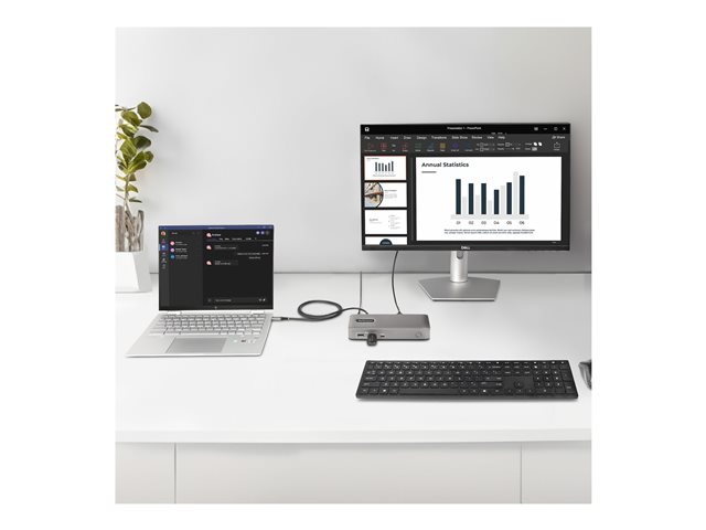 Cette station d'accueil USB Type-C étend la connectivité d'un ordinateur portable USB-C. Il permet la prise en charge de deux écrans avec des performances vidéo 2 560 x 166 à 30 Hz non compressées, en fonction de l'ordinateur hôte. La station d'accueil peut prendre en charge une seule résolution 4K à 60 Hz. La station d'accueil prend également en charge l'utilisation d'écrans ultra-larges. La station d'accueil ajoute sept ports USB en aval : 2 ports USB-A (5 Gbit/s), 1 port USB-C (5 Gbit/s) et 4 ports USB 2.0 (480 Mbit/s). La station d'accueil est dotée d'une installation sans pilote et est compatible avec les ordinateurs USB-C et Thunderbolt 3/4. Il est compatible avec les ordinateurs Windows et ChromeOS. La station d'accueil est dotée d'un port hôte USB-C verrouillable et d'un câble hôte verrouillable de 3,3 pieds certifié USB-IF.