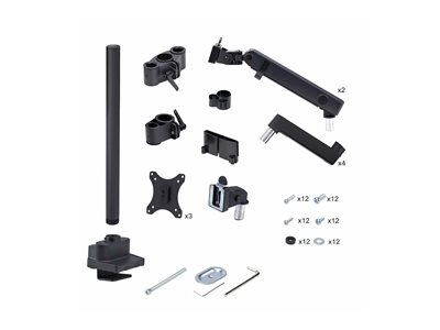 | Contenu de l'emballage | 2 x bras de ressort, 3 x VESA monitor mounts, 4 x bras pivotants, pôle, 12 x vis M4 x 12, 12 x M4x16 screws, clip de gestion de câble, clé hexagonale (3 mm), clé hexagonale (6 mm), 12 x M5x12 screws, 12 x M5x16 screws, 12 x flat washers, 12 x entretoises, pince de bureau, shoulder pole mount, center pole mount, center monitor mount, tool holder, grommet clamp plate, grommet clamp screw |