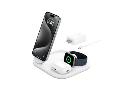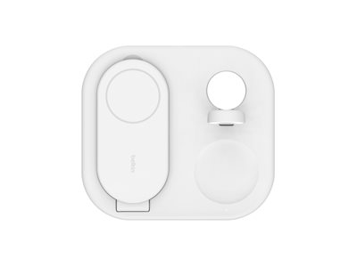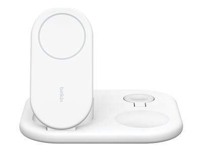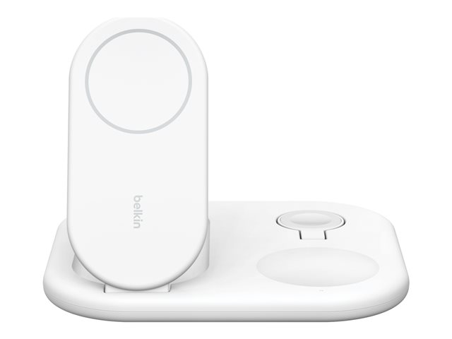 Belkin - Support de chargement sans fil - magnétique, pliable, avec Qi2 + adaptateur secteur - 15 Watt - Fast Charge - blanc - pour Apple iPhone 12, 13, 14, 15
