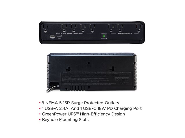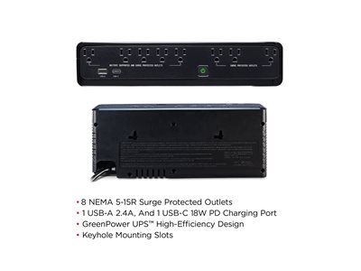 | Connecteurs de sortie | 3 x power NEMA 5-15R (anti-surtensions) ¦ 5 x power NEMA 5-15R (anti-coupures et anti-surtensions) ¦ 1 x USB de type A 4 broches 2.4 A ¦ 1 x 24 pin USB-C 18 W |