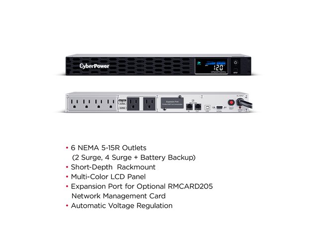 CyberPower PFC Sinewave Series CP500PFCRM1U - Onduleur (rack-montable) - CA 120 V - 300 Watt - 500 VA - 7 Ah - USB, serial - connecteurs de sortie : 6 - PFC active - 1U - noir