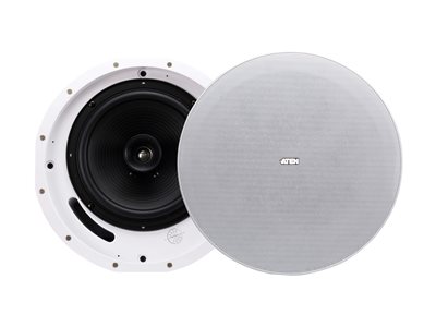 The ATEN AS108 is a versatile speaker system designed for in-ceiling mounting, providing sound quality for any environment. With a two-way coaxial design, it features an 8-inch woofer driver and a dome tweeter driver, ensuring clear audio across a frequency range of 65 - 20,000 Hz. The speaker operates with an impedance of 8 ohms and offers both 70V/100V and direct 8 ohm operation, making it suitable for various audio setups. Equipped with a passive amplification type, this speaker delivers a continuous power of 80 watts and peak power of 160 watts, providing performance for diverse applications. Durability is key with the ATEN AS108, crafted from ABS plastic and zinc plated steel. The paintable grille in white allows for seamless integration into various interior designs. Operating effectively in a humidity range of 0 - 80% RH and temperature conditions between -20°C to 60°C, this speaker withstands a range of environmental factors, making it an ideal choice for both residential and commercial spaces.