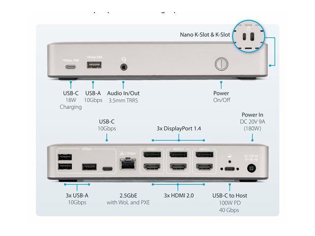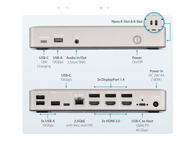 | Description du produit | StarTech.com Triple-Monitor USB4 Docking Station, 4K 60Hz HDMI or DisplayPort, 100W Laptop Charging, 2.5GbE, USB-C Multi-Monitor Dock, Driverless - station d'accueil - USB4 / Thunderbolt 4 - 3 x DP, 3 x HDMI - 1GbE, 2.5GbE |