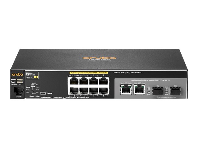 HPE Aruba 2530-8G-PoE+ - Commutateur - Géré - 8 x 10/100/1000 (PoE+) + 2 x SFP Gigabit combiné - de bureau, Montable sur rack, fixation murale - PoE+ - recommercialisé