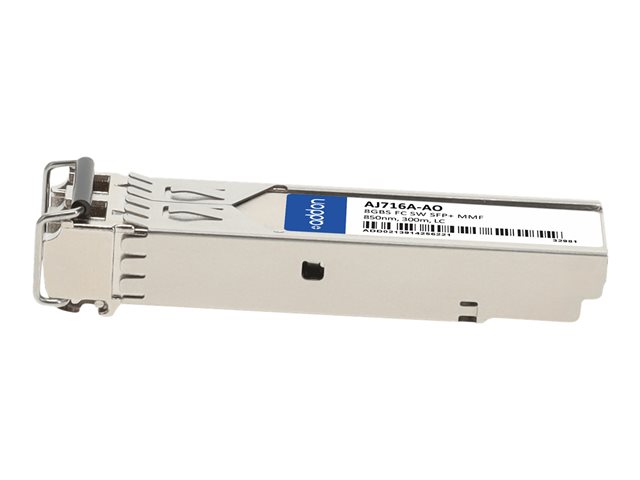 AddOn HP AJ716A Compatible SFP+ Transceiver - Module transmetteur SFP (mini-GBIC) - Fibre Channel 8 Gb - Canal à fibre optique - LC multi-mode - jusqu'à 150 m - 850 nm - pour HPE 1606, 8/24, 8/8, SN6000, SN8000B 32; BLc3000 Enclosure; StoreFabric 8/24 8Gb