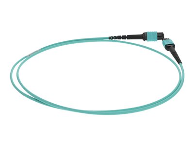 This is a 3m MPO (female) to MPO (female) 12-strand aqua crossover riser-rated fiber patch cable. An OM3 cable has a core size of 50 microns that supports 10 Gigabit Ethernet at lengths measuring up to 300 meters, and 40 Gigabit or 100 Gigabit Ethernet measuring up to 100 meters. This optical fiber, nonconductive, riser (OFNR) cable is best suited for use in interior fiber-optic applications. Our patch cables are 100% compliant for all of your networking needs. Our products are guaranteed by federal law to not affect or void OEM warranties.