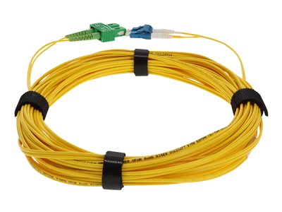 This is a 1M APC/SC (8 degree angled polished connector, which helps prevent back reflection) to LC SMF duplex patch cable. It is specifically designed to connect to a patch cable with a APC-SC connector, and is not designed to connect to transceivers. This high quality SMF (9/125) patch cable is specifically designed for ethernet, multimedia, or communication applications. This patch cable is suited for LANs or SANs, and can be purchased with a PVC jacket or low smoke zero halogen (LSZH) jacket. A LSZH jacket protects from toxic and corrosive gases in badly ventilated spaces and other areas where it is most crucial. It also provides the fire protection needed to run within walls and air plenums eliminating the need for conduits. The injection molding process provides each connection greater durability in resisting pulls, strains, and impacts from cabling installs. They provide higher speeds and increased bandwidth compared to conventional twisted-pair copper cable. Each cable is 100% optically tested for insertion loss before you take ownership. The patch cables are 100% compliant for all of your networking needs. The products are guaranteed by federal law to not affect or void OEM warranties.