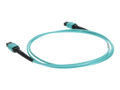 This is a 1m MPO (female) to MPO (female) 12-strand aqua straight riser-rated fiber patch cable. An OM4 cable has a core size of 50µm microns that supports 10 Gigabit Ethernet at lengths measuring up to 550 meters, and 100 Gigabit Ethernet measuring up to 150 meters and is reverse compatible with OM3. This optical fiber, nonconductive, riser (OFNR) cable is best suited for use in interior fiber-optic applications. Our patch cables are 100% compliant for all of your networking needs. Our products are guaranteed by federal law to not affect or void OEM warranties.