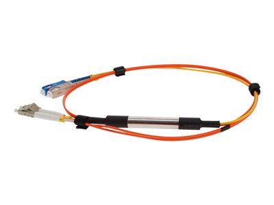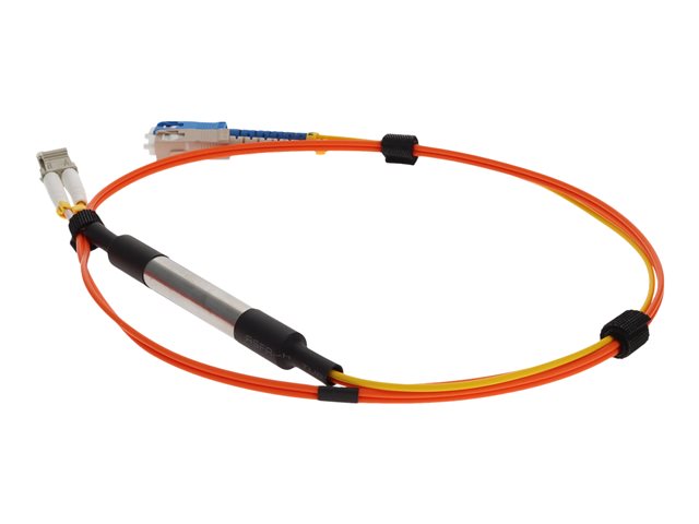 This is a 10m 62.5 micron fiber optic mode conditioning patch cable. This cable is a duplex multi-mode cable with a short segment of single mode fiber at the transmitting end. Specifically, it includes a 2 x LC 62.5/125 micron to 1 x SC 62.5/125 & 1 x SC 9/125 micron cable. The mode conditioning patch cable uses an offset splicing coupler, coupling the single mode fiber to the multi-mode section of the cable. The offset occurs from the center of the multi-mode fiber. Our fiber mode patch cables are to be used with LX, or longwave, gigabit ethernet transceivers that use both SM and MM fibers. With normal multi-mode patch cables, the transceivers can generate multiple signals causing differential mode delay (DMD), severely limiting transimission distances. Our fiber mode conditioning cables remove these multiple signals, eliminating problems at the receiver end. These cables are recommended for multi-mode cable runs greater than 50 feet. The fiber mode conditioning patch cables are 100% compliant for all of your networking needs. They are compliant with IEEE 802.3z and provide low insertion loss. The patch cables are 100% compliant for all of your networking needs. The products are guaranteed by federal law to not affect or void OEM warranties.