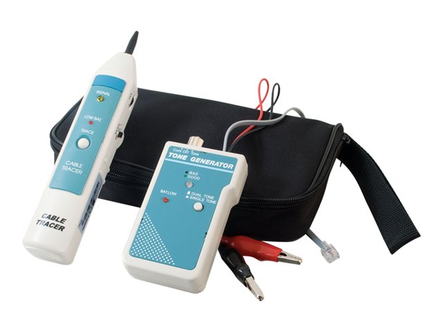 A highly practical network installation and troubleshooting tool which features a single or multi-tone signal, two test leads and a 4-conductor modular cable. The tone generator's signal is easily traced by the probe, even when cables are in a bundle or hidden in a mess of punch down blocks or wall plates. This system verifies cable continuity, identifies wiring faults, and determines line polarity and voltage in network and modular telephone lines without damaging cable insulation.