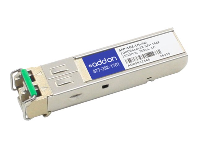 AddOn Juniper SFP-1GE-LH Compatible SFP Transceiver - Module transmetteur SFP (mini-GBIC) - 1GbE - 1000Base-ZX, 1000Base-LH - mode unique LC - jusqu'à 70 km - 1550 nm - pour Juniper Networks MX5; ACX Series Universal Metro Router ACX5448; MX-series MX2010, MX204