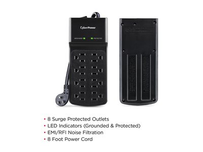 The CyberPower B808 8 outlet surge protector offers a high level of surge protection for common home and office electronics such as computers and peripherals, home theater equipment, and appliances. With 2180 joules of surge protection, the B808 prevents power surges and power spikes caused by storms and electrical grid fluctuations from reaching and potentially harming your valuable electronic equipment. The B808 comes with 8 standard, grounded power outlets and an extra-long 8 foot power cord with a low profile grounded plug which fits tightly against walls for unimpeded placement behind furniture.