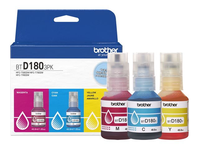 | Description du produit | Brother BTD1803PK - pack de 3 - à rendement élevé - jaune, cyan, magenta - original - recharge d'encre |