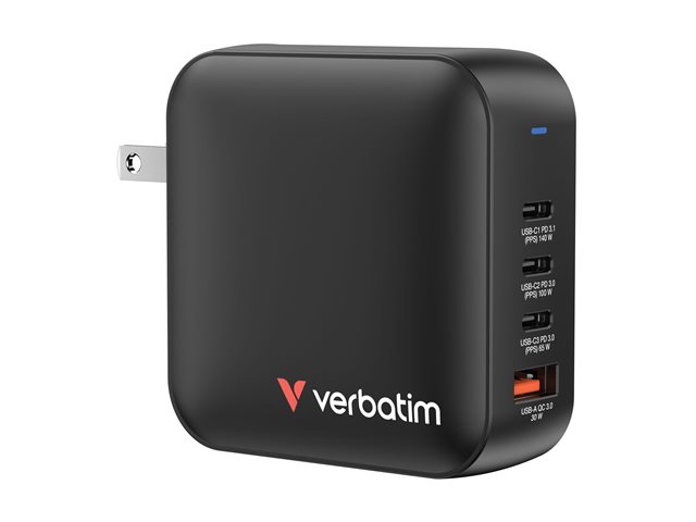 Verbatim - Adaptateur secteur - GaN - 165 Watt - 5 A - PD 3.0, PD/PPS, QC 4.0 - 4 connecteurs de sortie (3 x USB-C, USB)