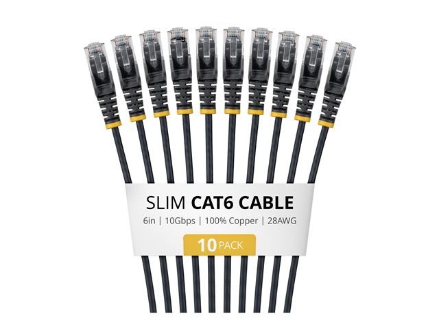 The StarTech.com N6PAT6INBKS10PK patch cable is designed to ensure reliable data transmission with minimized Near-End Crosstalk (NEXT), making it an essential tool for networking applications. With a sleek design that features snagless connectors, this cable avoids potential damage during installation and provides a durable setup. The cable is constructed with a low smoke zero halogen (LSZH) jacket material, ensuring safety in case of fire, while its stranded design offers flexibility for various environments. This CAT 6 cable supports frequencies up to 250 MHz, meeting compliance standards with RoHS certification for environmental safety and TIA/EIA-568 standards for performance.