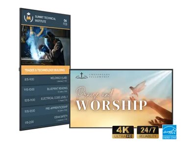 The Planar SLE50 is a versatile 50-inch LED-backlit LCD flat panel display designed for digital signage and commercial use. With a 4K UHD (2160p) resolution and a brightness of 500 cd/m2, this display ensures vibrant images with exceptional clarity. Its 60 Hz frame rate and 90% DCI-P3 color gamut deliver smooth motion and rich colors, making it ideal for any viewing environment. Engineered for continuous operation, the SLE50 can run 24 hours a day without compromising performance or reliability.