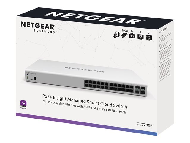 The NETGEAR Insight Managed Smart Cloud GC728XP is the first 28-port Gigabit Ethernet PoE+ Switch from NETGEAR with anytime, anywhere remote/cloud management. Using either the NETGEAR Insight mobile app or the new Insight Cloud Portal you can easily setup, monitor and manage your Insight Managed Switches, Wireless Access Points, and business-class ReadyNAS storage. The NETGEAR GC728XP features 24 copper Gigabit Ethernet ports, 390W PoE budget, 2 SFP 1G and 2 SFP+ 10G fiber ports for maximum flexibility and connectivity in your network. With its remote cloud manageability, and advanced L2+/L3 Lite features, it's the most versatile switch on the market for any environment!