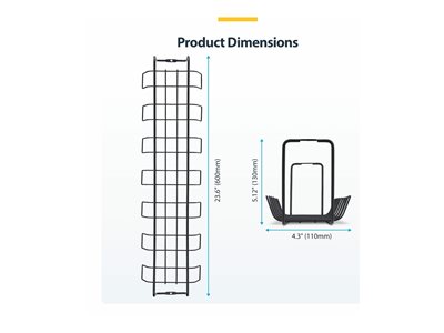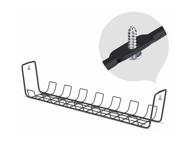 Maintain a clean, organized workspace and reduce the risk of tripping hazards or tangled cords with this 24in (615mm) long under-desk cable management tray. Each tray is 5.2in (132.5mm) wide and 5in (130mm) deep to accommodate larger power bars and strips. Built to support up to 11lb (5kg) per tray, the trays securely hold multiple cables, cords, chargers, power bars, and strips without sagging. Integrated cable management slots improve accessibility and enhance workspace aesthetics by keeping cords neatly routed, contributing to better airflow. Easily mounts under wooden desks with a minimum thickness of 0.78in (20mm). All necessary hardware is included (2 wood screws) for a stable, straightforward installation. Powder-coated steel is durable, resistant to scuffs and damage, and remains stable even when fully loaded for long periods of time. Ships in ISTA-6 certified packaging to withstand various transportation conditions and handling processes.